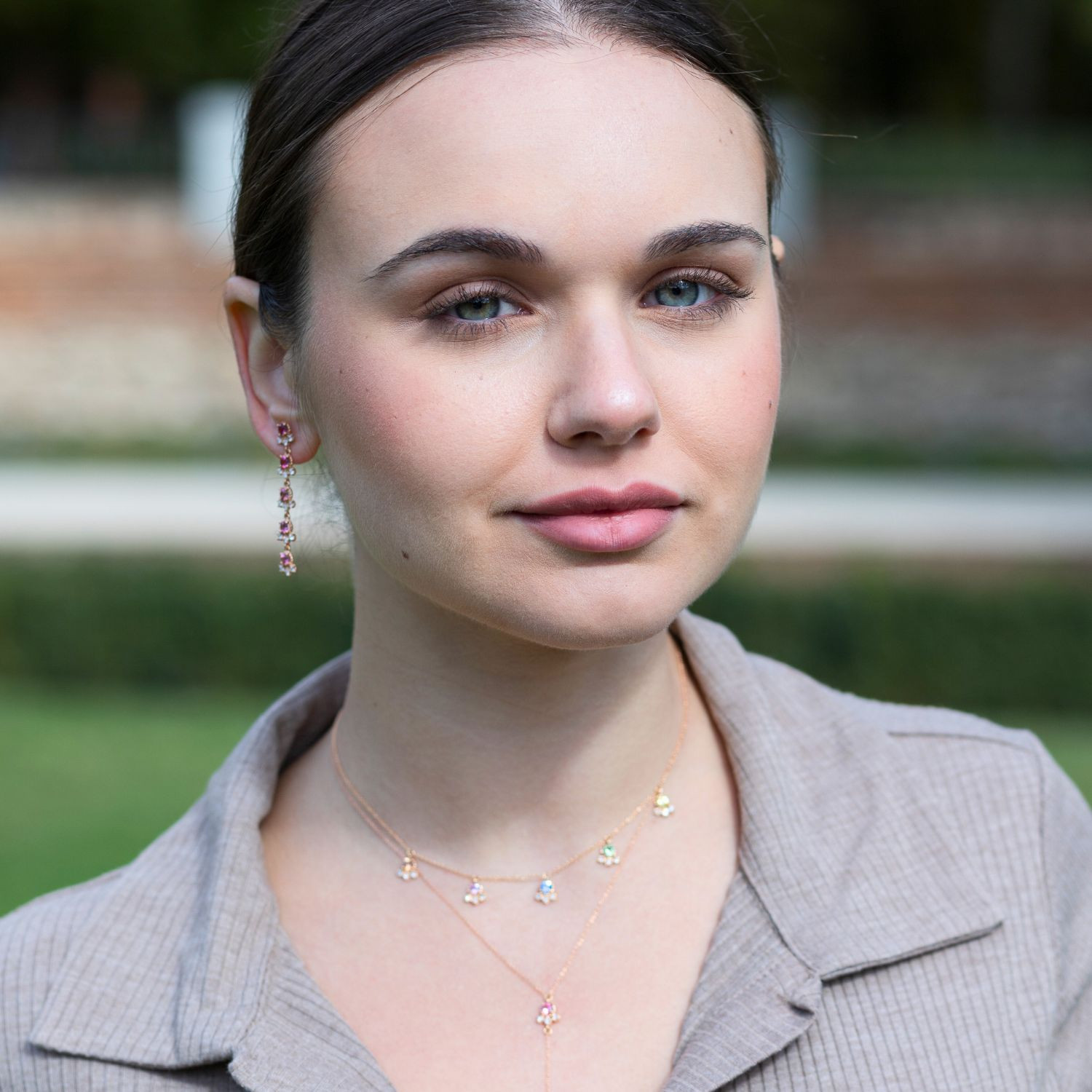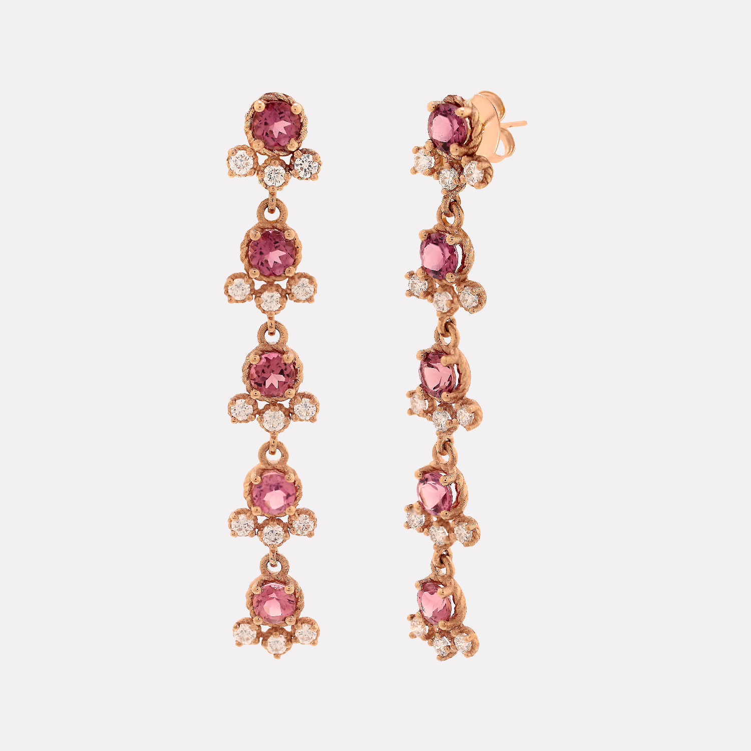 Pendientes Largos de la Colección Blanche, realizados en oro rosa, turmalinas rosas y diamantes talla brillante.